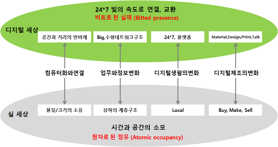 -공간(Atomic) vs. 데이터(Bitted): 산업시대는 공간(Atomic)을 점유한 물질(물건)의 생산성의 향상과 그에 따른 유래 없는 인류사회는 물질적 풍요함을 경험하고 있다. 디지털 세상은 데이터 (Bitted)화된 어떤 것이 정신세계에 영향을 미치고 물질은 기본적인 재료만 있으면 만들어지고 사용된다.