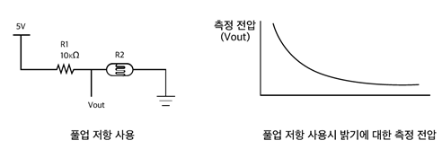 조도센서도 일종의 저항이나, 빛의 양이 매우 많은 경우, 저항이 매우 작아져 과전류가 흐를수 있다. 그리고 조도센서의 저항 값에 따른 전압을 신호로 입력받기 위해서 10K 저항을 달아준다. 이 예제에서는 풀업 저항을 사용한다. 풀업 저항 사용 시, 조도센서의 저항값에 따라 전압 분배가 일어나며, 빛의 양이 많을수록 (밝을수록) 측정되는 전압의 크기는 작아진다.