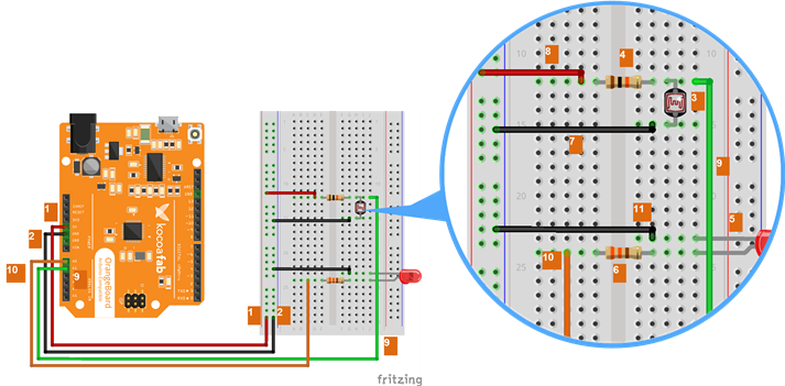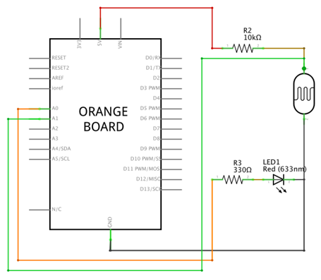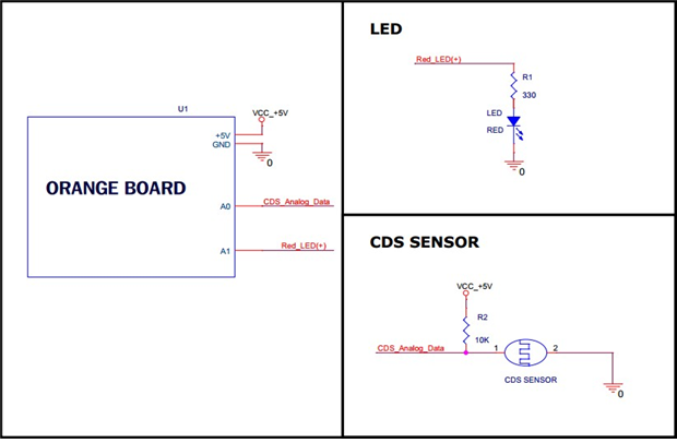 이 예제에서 사용된 조도센서(CdS)는 옥외주차장, 휴식중의 극장 객석 정도의 빛의 양(10 Lux) 에서 약 10KΩ의 저항을 가지며, 아무런 빛이 없는 암실에서 약 200KΩ의 저항을 가진다.