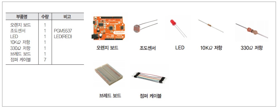 오렌지보드로 광량을 측정해보기 위한 준비물은 아래와 같다.