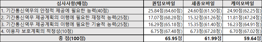 3사 모두 비현실적이거나 서비스 기준에 부합하지 못하는 망 구축 계획을 제시해 미래부로부터 안정적 서비스 제공 측면에서 구체적인 준비사항이 미흡하다는 지적을 받았다. 재정적 능력 면에서도 자금조달 계획이 불확실했으며, 이에 업계에서는 강력한 1대 주주가 없기 때문이라는 이야기가 나왔다. 기술적 측면은 그나마 높은 평가를 받았으나 역시 적격 기준에는 미치지 못했다.
