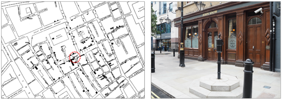 존 스노우 박사는 콜레라의 원인을 밝히기 위해 공간에 대한 정보를 활용했다. 소호라는 공간의 구조를 파악하고, 이곳에 거주한 환자의 위치를 기록하며, 이를 종합해 브로드윅가의 펌프가 발병의 원인이라는 것을 알아낸 것이다.