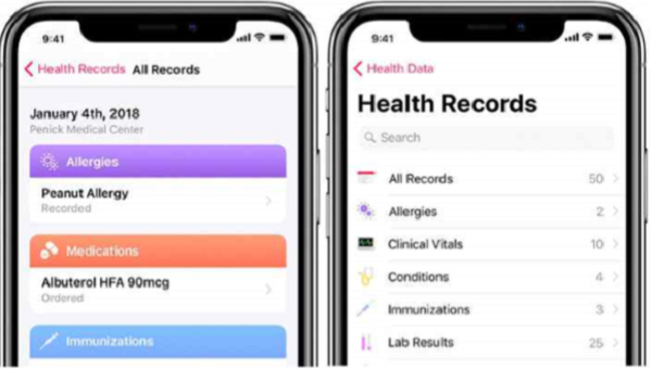 애플의 애플 헬스 레코드는(Apple health record)는 병원의 전자의무기록(EMR)에 저장된 진료, 처방 기록들을 iOS 기기로 가져올 수 있게 하는 서비스인데, 이를 통해 개별 병원들은 환자의 동의하에 통합된 환자 의료 정보를 확보하고 보다 정확하게 환자를 진단·관리할 수 있게 된다. 2018년 3월 출시 두 달 만에 39개 병원이 애플 헬스 레코드와 연동했으며 2019년 9월 현재 200개 이상의 병원으로 빠르게 확산되고 있다(Apple 홈페이지(2)).