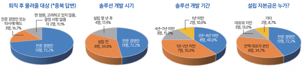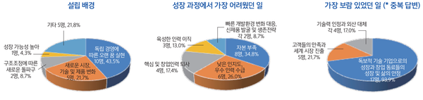 이 같은 의지와 열정은 “사업에 대한 후회 여부”에 대한 응답에서도 그대로 드러났다. 즉 전체 23개 기업 가운데 91%인 21개 기업이 “후회 없다”와 “만족 & 매우 만족” 또는 “후회 할 시간 없음”에 응답했고, 나머지 2개 기업 대표도 “가끔 후회” 또는 “후회(청춘을 통째로 사라진 것 같아)는 하지만 그러나 돌아가도 다시 할 것”이라고 응답해 거의 모든 대표이사들이 현 사업에 대한 강한 의지와 자긍심을 갖고 있는 것으로 분석된다. 또한 후회할 시간도 없을 만큼 바쁘다는 것은 그만큼 비즈니스에 열정을 다 하고 있다는 것으로 해석된다.