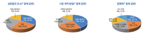 이 같은 응답을 종합해 볼 때 이들 기업들의 경쟁력 배경은 각 분야에서 자사만의 독자적인 기술 개발 및 제품화가 가장 중요한 것으로 분석된다. 두 번째는 우수 인력을 바탕으로 한 자사만의 독자적인 경험 노하우 축적으로 나타났다. 참고로 세계 최초 기술 및 솔루션 개발 기업을 보면 스콥정보통신(IPAM: IP Address Management, IP주소관리), 소프트캠프(DRM 기술), 유니온커뮤니티(지문인식알고리즘) 등이 대표적이다. 이들 기업들의 공통점은 해외시장에 진출해 자사만의 영역을 구축했고, 일본 시장을 가장 먼저 공략했다는 게 특징이다. 유니온커뮤니티와 소프트캠프는 지난 2016년과 2019년에 각각 코스닥에 상장했다.