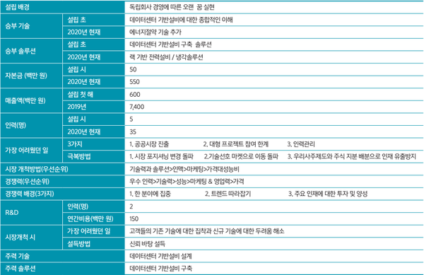 예를 들어 설립 당시 △월 마운트 냉각 솔루션으로 시작했지만 10년 후 △모듈형 백업 솔루션을, 15년 후에는 △랙 마운트 솔루션, 그리고 최근에는 △랙 기반 전력설비 및 냉각 솔루션 등을 시장 트렌드에 맞춰 개발하면서 고객을 확보해 왔다는 것이다. 인력들도 일당백이라고 할 만큼 이 분야 최고의 전문가들로 구성됐다고 한다. 5명으로 시작한 인력은 지난해 말 현재 35명으로 11배 늘었고, 매출은 설립 첫 해 6억 원이었지만 지난해 말 현재 74억 원으로 12배 이상 커졌다.