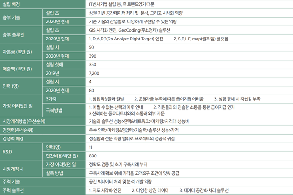 아무튼 오픈메이트는 지난 2001년 6월 설립 당시 상권 기반 공간데이터 처리 및 분석, 그리고 시각화 기술로 비즈니스를 시작했고, 이젠 이를 산업별로 더 세분화 및 상세화 시킨 기술로 성장 발전했다. 솔루션도 설립 당시에는 ‘GIS 시각화 엔진’ 및 ‘GeoCoding(주소 정제)’였지만 2020년 현재는 ‘D.A.R.T(Do Analyze Right Target) 엔진’ 및 ‘공간정보 포털(S.E.L.F map)’ 등의 솔루션으로 확장 발전시켰다. DART 엔진은 대한민국 전 가구를 세분화해 아주 작은 규모의 시장까지도 분석할 수 있는 엔진이다. 예를 들어 고객들이 보유하고 있는 주소와 성, 연령만을 갖고 30가지 가구 소비를 클러스터 유형의 판별이 가능하지만, 30가지 가구소비 클러스터 유형별 라이프스타일, 소비패턴 등의 포괄적 정보를 제공해 준다는 것이다. ‘S.E.L.F map’ 플랫폼은 ▲ 자료의 공간화, ▲ 정보의 풍부화, ▲작성된 공간정보들의 손쉬운 탐색, ▲ 공간정보 분석을 통한 의사결정지원 등의 4가지 특징을 갖고 있다고 한다.