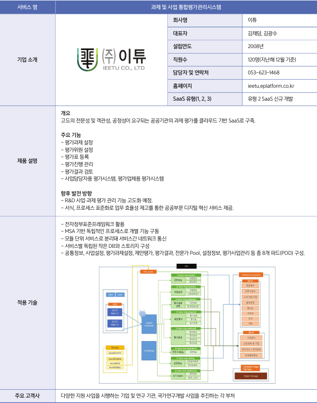 이튜는 2022년 NIA의 ‘공공부문 SaaS 이용 개발‧검증 사업’에 유형 2, 신규 SaaS 개발 부문에 참여해 ‘과제 및 사업 통합평가관리시스템’을 개발했다. 이에 대해 회사 측은 “최근 연구개발 사업 투자가 증가하고 있으며, 개별기관 및 기업의 성과 평가를 지원할 수 있는 통합평가관리 시스템이 부재했다. 이에 NIA의 사업을 통해 해당 분야 사업 관리 SaaS를 개발해 공공시장을 확대하고자 했다”고 설명했다.