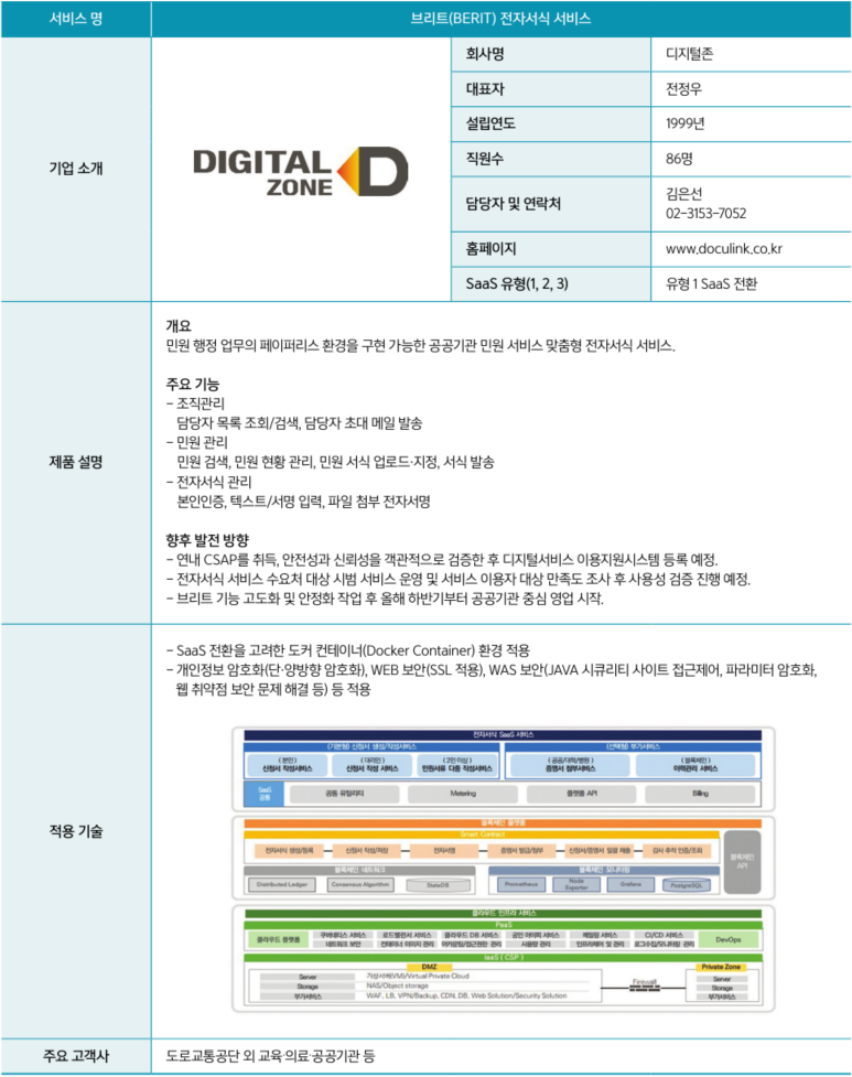 디지털존은 NIA의 ‘공공부문 SaaS 이용 개발‧검증’ 사업에서 유형 1로 신청해 기존 SW를 SaaS로 전환했다. SaaS 명은 ‘브리트(BERIT)’로 각종 전자서식 업무에 적용할 수 있는 SaaS다. HWP, DOC, XLS, PDF 등 다양한 확장자 서식 파일 업로드가 가능하고 텍스트, 체크박스, 서명 등 전자서식 내 입력 영역을 자유롭게 설정할 수 있는 것이 특징이다. 아울러 별도 프로그램 설치 없이 PC, 모바일을 통해 본인 정보를 입력하고, 도장‧사인 이미지를 삽입할 수 있어 공공기관뿐만 아니라 모든 전자서식 업무에 적용할 수 있다.