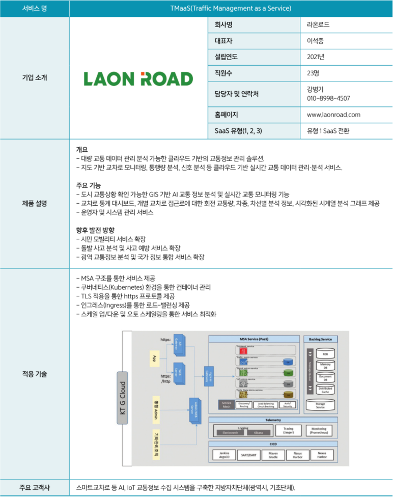 [컴퓨터월드] 라온로드(대표 이석중)는 2021년 설립된 스마트 교통 솔루션 전문기업이다. AI 영상 분석기술을 기반으로 AI를 탑재한 교통 영상 카메라를 개발했다. 경기도 안양시 인덕원 사거리에서 국내 최초로 AI 실시간 신호제어 교차로를 시범 운영한 바 있다. 라온로드는 사람과 모빌리티가 만나는 모든 도로에 안전하고 편리한 시스템을 구축하는 것을 목표로 비즈니스를 영위하고 있다. 라온로드는 ‘공공부문 SaaS 이용 개발‧검증’ 사업에서 유형 1로 신청했다. 라온로드가 이번 사업으로 전환한 SaaS의 명칭은 ‘TMaaS’로, 지자체 스마트 교통정보 관리 서비스다.