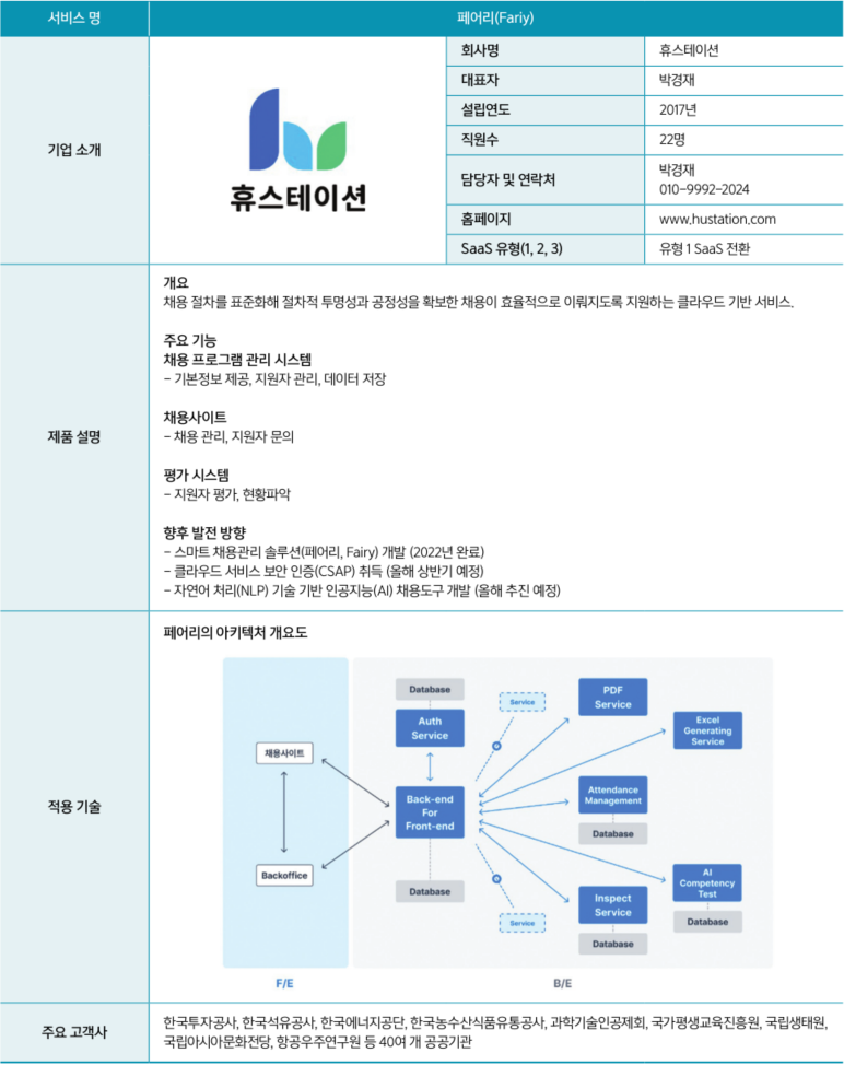 [컴퓨터월드] 휴스테이션(대표 박경재)은 2017년에 설립된 HR 솔루션 전문기업이다. 기업의 인력 채용 전문가와 IT 기술인력으로 구성돼있으며, 클라우드 기반 다양한 HR 관련 서비스를 개발‧공급하고 있다. 2021년 하반기 스마트 채용관리 솔루션 ‘라비스(RAVIS)’를 출시했고, 2023년 1월 기준 약 40개 공공기관에 공급했다. 2022년에는 NIA의 ‘공공부문 이용 SaaS 개발‧검증 지원사업’에 선정돼 공공부문 특화 HR 클라우드 서비스를 개발했다. SaaS 명은 ‘페어리(Fairy)’로 NIA의 지원을 받아 2022년 12월 개발 완료했다.