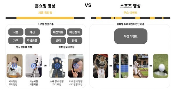 AI 기반의 하이라이트 구간 탐색이 비교적 보편화된 스포츠 비디오와 비교해보면, 커머스 비디오의 특수성이 두드러진다. 득점 이벤트라는 명확한 판단 기준이 존재하는 스포츠 비디오와 달리 개별 카테고리마다 제품을 소구하는 방식이 달라지기 때문에 커머스 비디오의 생리를 이해하고 있는 산업 전문가의 노하우를 모델에 이식할 수 있어야 한다. 그러나 시장에 존재하는 다양한 AI 편집 툴은 하이라이트 탐색 기능을 제공한다고 하더라도, 커머스 비디오의 이러한 특성에 최적화되어 있지 않기 때문에 원하는 사용자가 원하는 구간을 찾기까지 긴 탐색기간을 필요로 한다.
