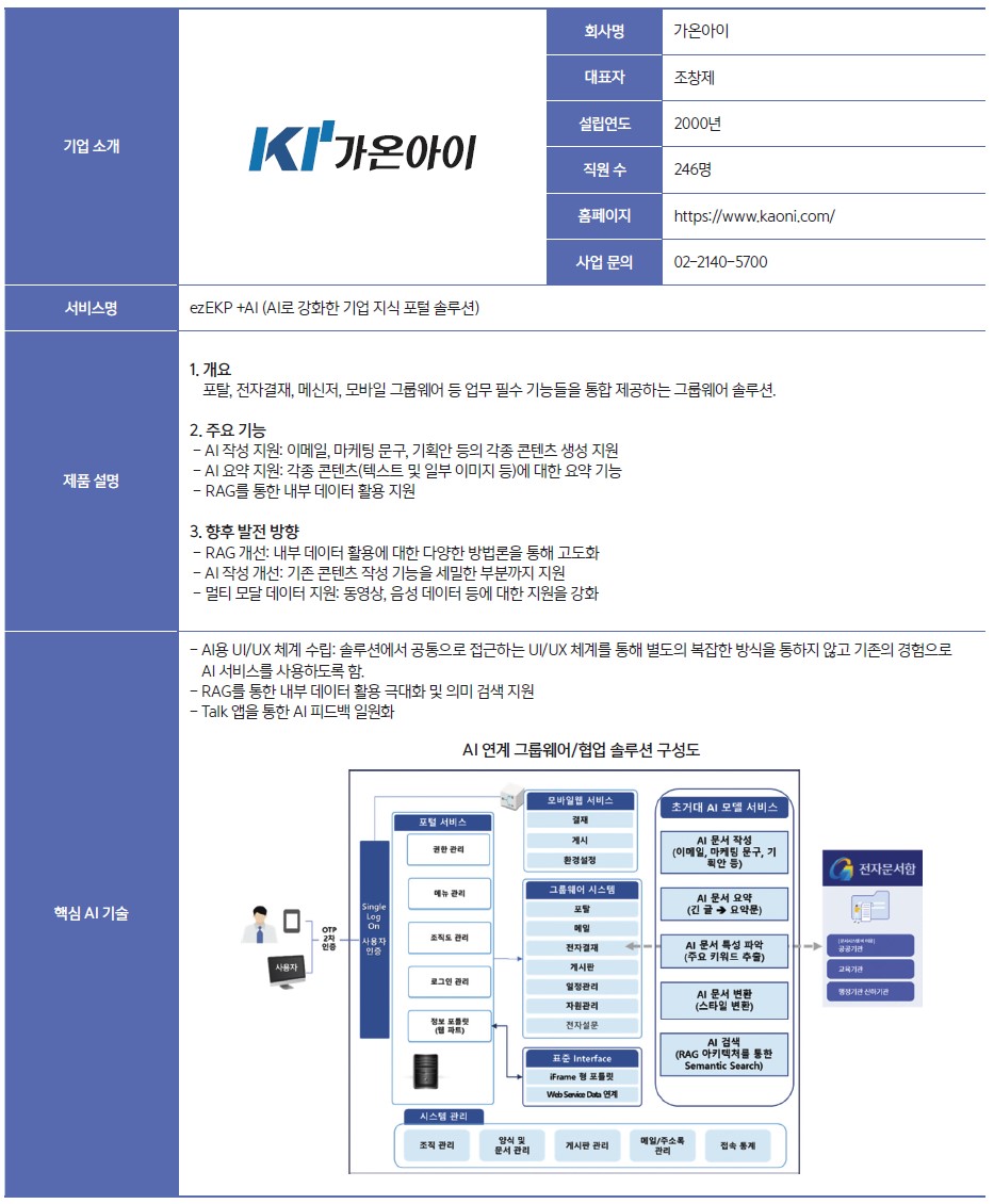 가온아이는 2000년 설립된 그룹웨어 및 협업 솔루션 전문기업이다. 초연결-초지능 정보사회의 중심에서 최고의 제품과 서비스를 제공하는 것을 목표로 협업솔루션 및 그룹웨어 개발&구축, 클라우드(SaaS) 서비스를 비롯해 공공사업(온나라, 기록관리), 유통사업 등을 통해 고객사의 IT파트너로서 역할을 수행하고 있다. 전체 임직원의 약 80%가 전문 개발인력으로 구성되어 있으며 약 5,000여 고객사를 보유해 차세대 업무 환경에 대한 기술력을 보유하고 있다. 가온아이는 현재 AI 전환기를 맞이하고 있으며 AI가 가진 특장점을 활용해 기존의 사람 중심 솔루션에 AI를 접목, 기존의 정형적이고 획일적인 소통 및 협업 방식을 더욱 강화하고 보다 나은 소통과 협업을 지원할 계획이다.