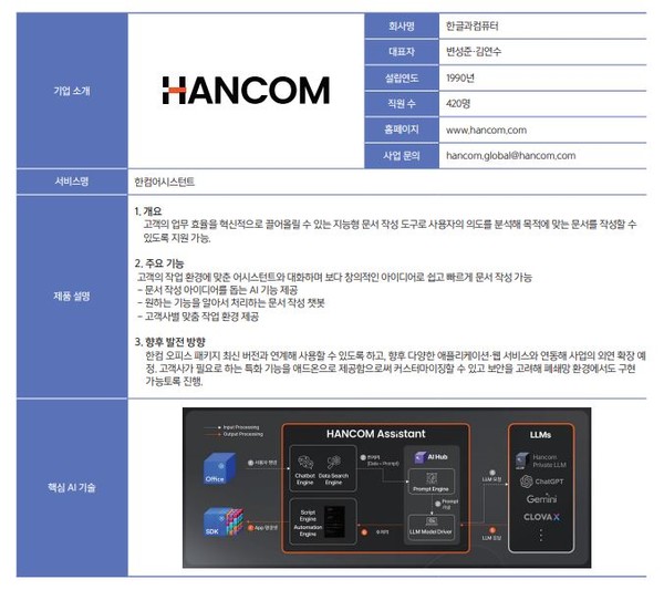 한컴은 ▲사용자 의도를 분석해 목적에 맞는 문서 작성을 도와주는 AI 문서 작성 도구 ‘한컴어시스턴트’와 ▲문서 내 정보에 기반한 AI 질의응답 시스템 ‘한컴피디아’ ▲학습 및 검색 증강 생성 솔루션의 핵심인 문서 데이터 추출 SDK ‘한컴 데이터 로더’ 등의 솔루션을 개발해 서비스 하고 있다.