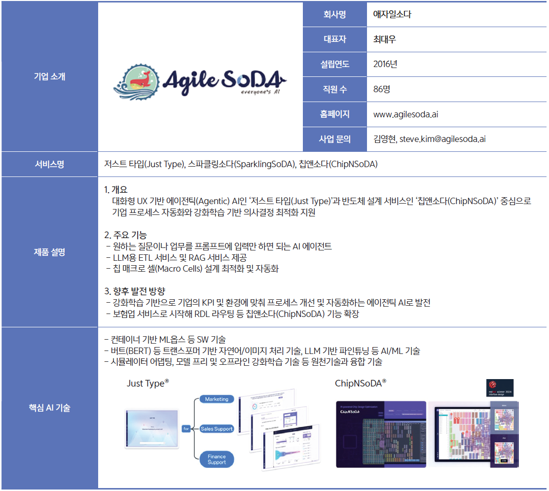 애자일소다는 기업용 AI 전문기업으로, 현재 직원수 86명 중 AI데이터과학자 및 엔지니어 등 AI 전문가가 전체 구성원의 78%에 달한다. 애자일소다는 기업이 “읽고 이해하고 판단하는 프로세스를 자동화하고 의사결정을 최적화하는 것”에 집중하고 있다. 이러한 미션을 중심으로 400여 개의 순수 AI 프로젝트를 완수한 바 있다.