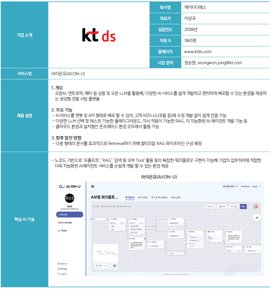 KT DS가 중점적으로 제공하는 AI 관련 솔루션은 앤트봇, 에이아이센트로, 아이온유 등이다. 생성형 AI 서비스를 기업이 쉽게 도입할 수 있도록 지원하는 생성형 AI 모델 서빙플랫폼인 아이온유는 상용부터 오픈소스까지 다양한 LLM을 지원한다. 특히, 노코드 기반으로 손쉽게 AI 서비스를 개발할 수 있는 스튜디어 기능을 통해 서비스를 직관적으로 개발, 테스트하고 배포할 수 있는 기능도 갖췄다.