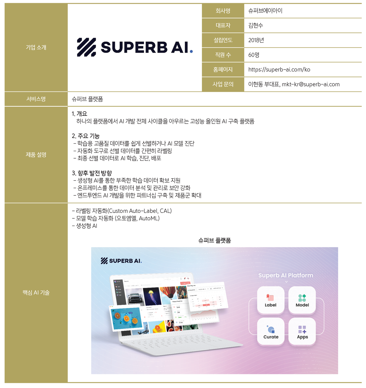 슈퍼브 플랫폼은 △데이터 유형·분포를 분석으로 고품질 데이터를 선별하거나, 학습한 모델을 진단할 수 있는 ‘슈퍼브 큐레이트’ △자동화 도구로 선별 데이터를 간편히 라벨링할 수 있는 ‘슈퍼브 라벨’ △최종 선별된 데이터로 AI를 학습·진단·배포하는 ‘슈퍼브 모델’ △각종 생산성 도구 모음인 ‘슈퍼브 앱스’ 등으로 구성된다.