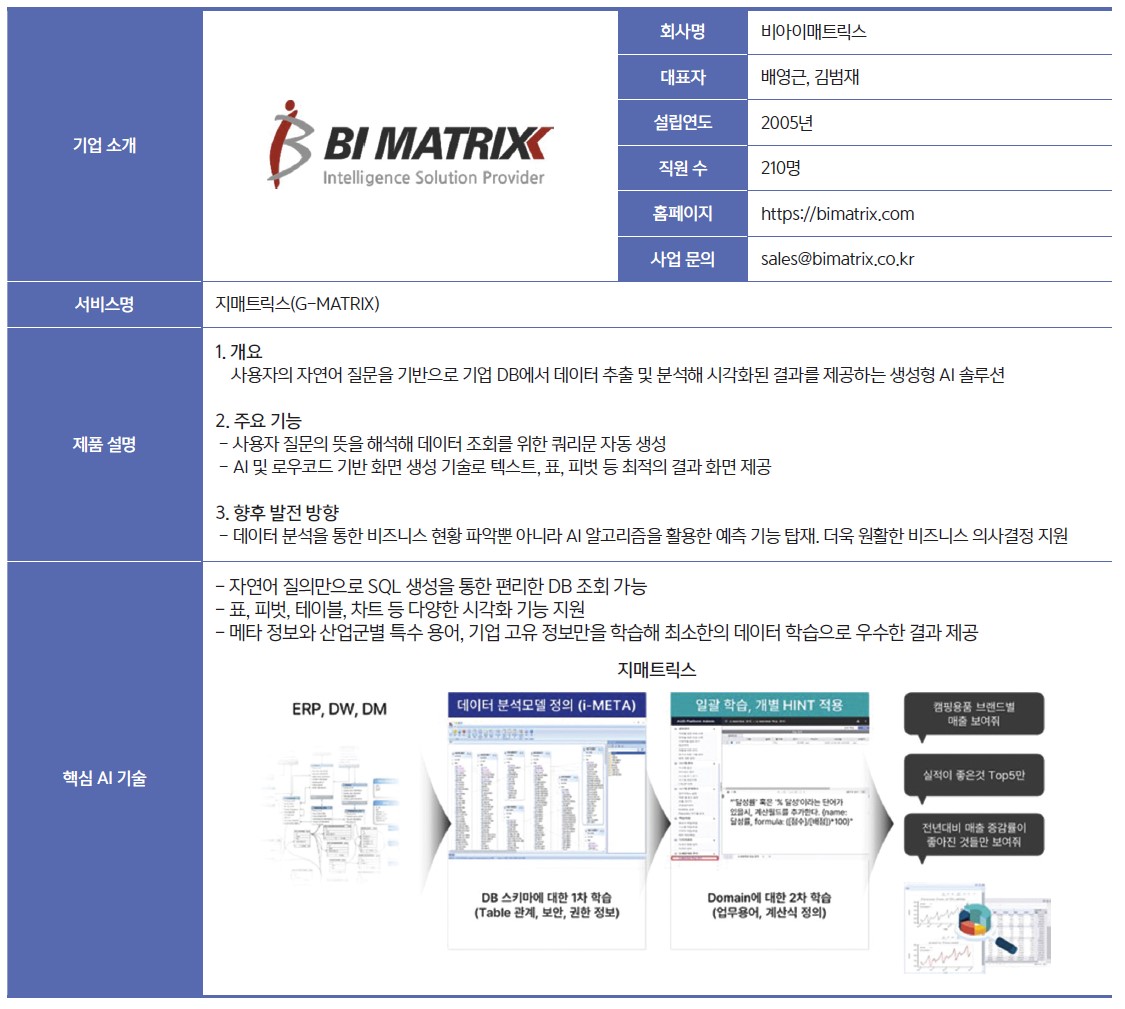 비아이매트릭스는 AI 기반 데이터베이스(DB) 분석 및 업무 시스템 구축 사업을 영위하고 있다. DB 분석은 AI, 데이터 마이닝 기술을 활용, 기업 데이터를 효과적으로 분석하고 예측하는 것이 핵심이다.