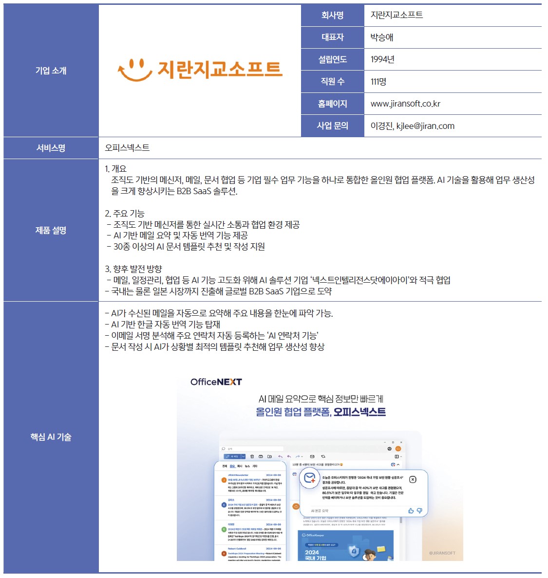 지란지교소프트는 오피스넥스트를 기반으로 디지털 전환 과정에서 어려움을 겪는 중소기업들을 위해 효율적인 소통과 협업이 가능한 디지털 업무 환경을 제공하고 있으며, 생성형 AI 기술을 활용해 반복 업무로 인한 비효율을 획기적으로 개선하는 데 주력한다는 계획이다.