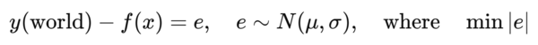 위 식을 간단히 설명하면, 세상의 변화(y(world))를 어떤 함수(f(x) : 물리식 혹은 머신러닝)로 표현하고 그 둘을 빼게 되면 내 모델로써 설명할 수 없는 오차(잔차)가 발생하게 되고, 모델링이란 것은 결국 이 오차를 최대한 작게(min), 그리고 아무런 의미(혹은 패턴)가 없도록(white noise)하는 것임을 표현하고 있다.