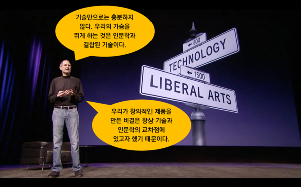 [컴퓨터월드] 세계 최고의 프로덕트 오너로 손 꼽히는 스티브 잡스는 2011년 아이패드2를 소개하는 프레젠테이션에서 “우리가 창의적인 제품을 만든 비결은 항상 기술과 인문학의 교차점에 있기 때문이다”라고 말했다. 그리고 그의 등 뒤의 프레젠테이션 슬라이드에는 기술(Technology)로 가는 길의 표지판에 600이라는 숫자가, 인문학(Liberal Arts)으로 가는 길의 표지판에 1500이라는 숫자가 적혀 있었다.