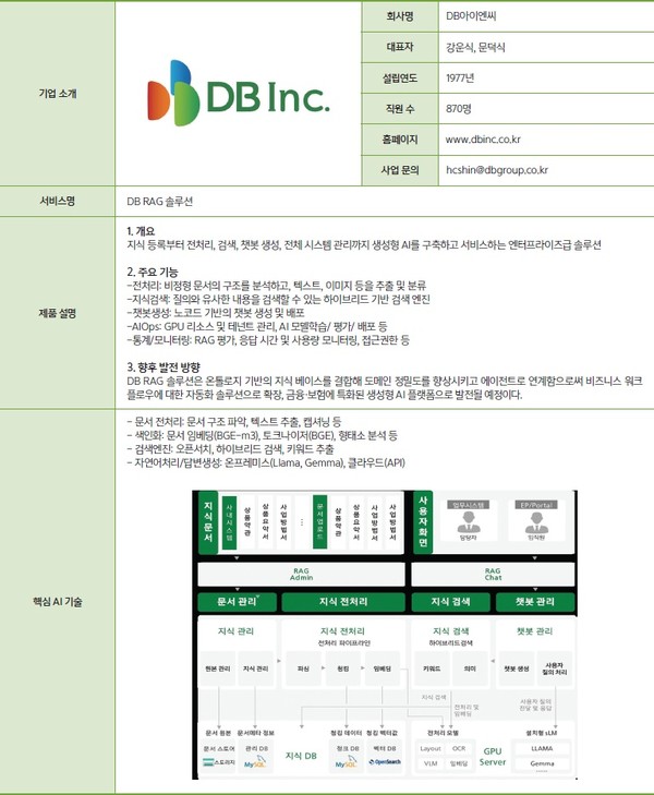 DB아이엔씨는 금융·보험 중심의 AI 사업 고도화를 통해 ‘AI 통합 서비스 기업’으로의 완전 전환한다는 목표다. 이를 위해 생성형 AI 플랫폼 ‘DB 젠(DB Zen)’을 중심으로, 도메인별 RAG 모델 정밀화와 AI 에이전트 확장을 추진 중이다. 또한 AI옵스를 통해 GPU 리소스·모델 학습·평가·배포를 자동화하고, 서비스 통계·모니터링 기능으로 운영 효율성을 높인다는 계획이다.