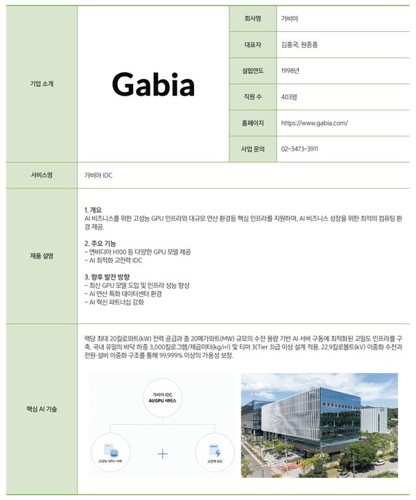 과천 IDC는 GPU 서버와 고전력 랙 인프라를 기반으로 AI 서비스 개발 및 운영에 적합한 고성능 환경을 제공한다. 또한 가비아는 MLOps 전문기업 베슬 AI와의 업무협약(MOU) 체결, AI 솔루션 기업 알고리즘랩스와의 협력을 통해 인프라와 AI 기술 역량을 동시에 강화하고 있다.