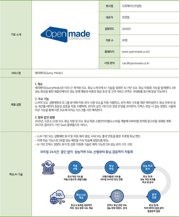 오픈메이드컨설팅 최영철 대표는 “쿼리메딕은 단순한 SQL 튜닝 차원을 넘어 DB 자원 효율화 혁신을 통한 운영 비용(DB자원, 클라우드) 절감 효과의 극대화를 지향하는 AI 솔루션”이라며 “DB 성능 관리자와 AI의 협업을 통해 DB/App 성능 최적화의 완전 자동화 시대를 열겠다”고 말했다.