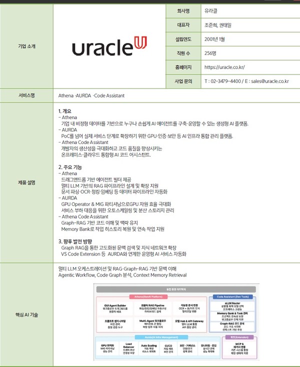 유라클은 엔터프라이즈 AI 혁신을 위한 △아테나(Athena) △오르다(AURDA) △아테나 코드 어시스턴트(Athena Code Assistant) 등 세 가지 핵심 솔루션을 보유하고 있다.
