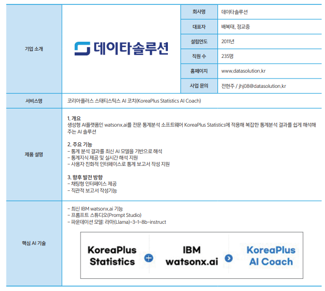 데이타솔루션은 AI 데이터 분석과 공공 SI 분야에서 오랜 기간 축적해 온 경험을 기반으로 성장했다. 최근에는 클라우드와 AI 플랫폼 기반의 생성형 AI 역량을 강화해 구축 서비스를 제공하고 있다. 이를 통해 대형 IT 고도화 프로젝트와 금융권 AI 플랫폼 구축 사업을 성공적으로 수행하는 성과를 거뒀다.