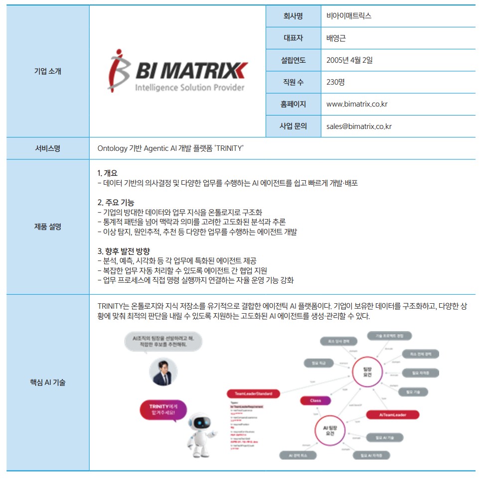 특히 TRINITY는 기업의 방대한 데이터와 업무 지식을 온톨로지로 구조화하고, 이를 활용해 통계적 패턴을 넘어 맥락과 의미를 고려한 고도화된 분석과 추론을 수행할 수 있다. 다양한 AI 에이전트를 개발해 이상 탐지, 원인추적, 추천 등 적재적소에 배포할 수 있도록 지원한다. 비아이매트릭스는 TRINITY를 시작으로 기업의 데이터 기반 의사결정 과정을 혁신해 나갈 방침이다.