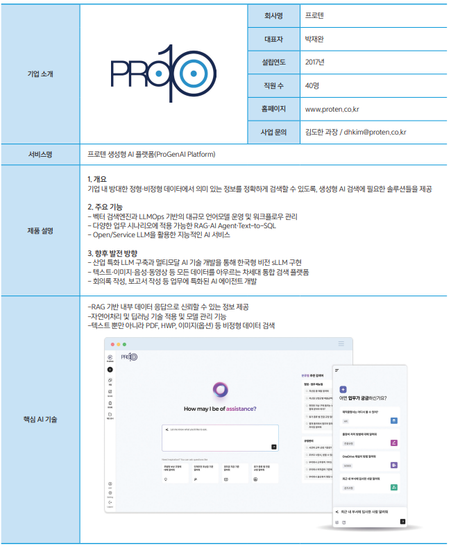 프로텐은 생성형 AI 검색에 필수적인 다양한 기술 라인업인 △RAG △Hybrid Search △sLLM △LLMOps △개인정보 추출 및 분석 △문서 변환 및 뷰어 △웹 크롤링 등의 솔루션을 모두 갖추고 있으며 고객의 요구에 따라 맞춤형 AI 시스템을 구축할 수 있는 풀스택 역량을 갖추고 있다.