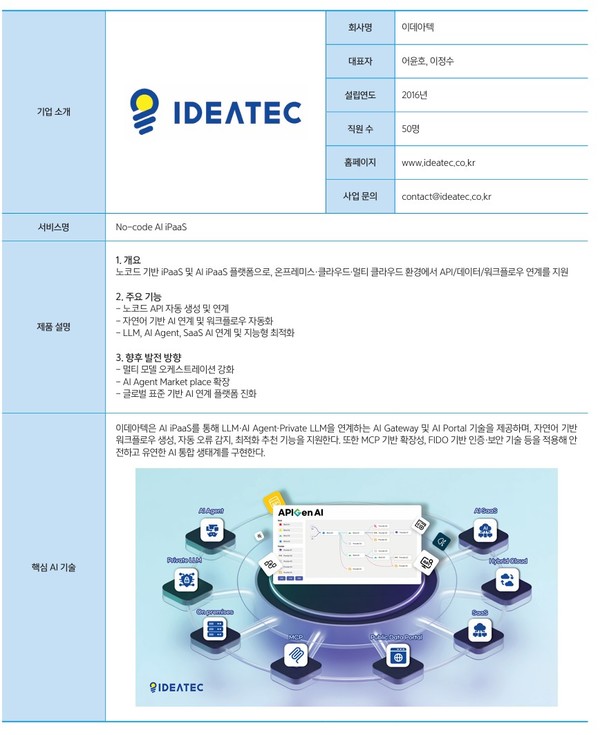 이데아텍은 제품 준비성(Product Readiness), 산업별 실적(Use Case Validation), 생태계 파트너십(Ecosystem Partnership) 등 3개의 축을 중심으로 AI 사업을 강화하고 있다. 현재 엔터프라이즈급으로 검증된 iPaaS 및 인증 솔루션을 기반으로 AI 연계 기능을 단계적으로 확장하고 있으며, 삼성물산, OB맥주, 현대자동차, 신한은행, 우리은행 등 글로벌 및 금융권 고객 사례를 통해 기술력과 안정성을 입증했다. 아울러 멀티 LLM, 에이전틱 AI, SaaS AI 연계 등 글로벌 파트너십을 통한 생태계 확장 전략으로 글로벌 시장 접근성을 높인다는 전략이다. 앞으로 iPaaS는 AI와 결합해 사람과 AI가 자연스럽게 협업하는 AI플랫폼으로 진화할 것이다. 이데아텍은 이를 통해 일과 삶의 균형을 지원하고, 연결된 세상에서 자동화·보안·지능화가 공존하는 환경을 만들어갈 것이다.