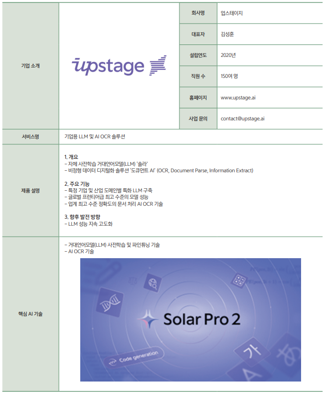 업스테이지는 2025년 4월 CB Insights가 선정한 세계 100대 기업 중 모델 개발 및 학습 부문 대표 기업으로 뽑혔다. 또한 정부의 글로벌 AI 3대 강국 진입 프로젝트에서 유일한 스타트업으로 선정돼 국가대표 AI 기업으로 인정받았다. 최근에는 아마존, AMD 등이 참여한 620억 원 규모의 시리즈 B 투자를 완료하며 누적 투자금 2,000억 원대를 돌파했다. 이는 국내 AI 소프트웨어 기업 중 최대 규모다.