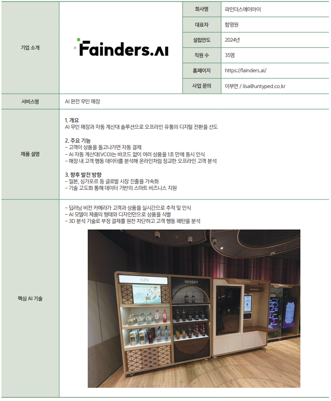 파인더스에이아이가 제공하는 첫 번째 핵심 솔루션은 AI 완전 무인 매장 솔루션이다. 이 솔루션은 다수의 카메라와 스마트 선반을 이용해 고객이 상품을 들고 나가기만 하면 자동으로 결제가 완료되는 시스템이다. 이는 일반 셀프 계산 매장보다 고객에게 훨씬 간편한 쇼핑 경험을 제공하며, 기술적으로는 도난을 방지하도록 개발됐다. 특히 30평 미만의 소형 매장에 최적화돼 높은 비용 경쟁력을 갖추고 있으며, 실제 운영 중인 무인 매장에서 고객의 구매 주문 정확도를 95%에서 99% 이상으로 확보했다.