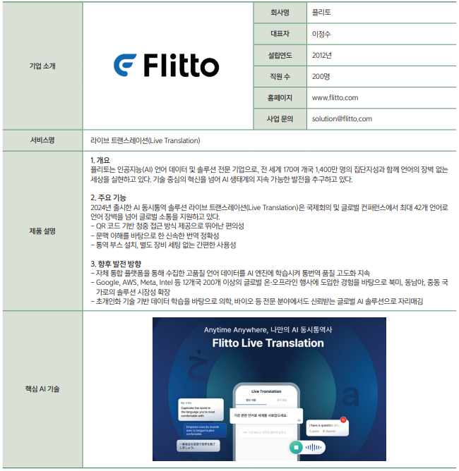 플리토는 언어데이터 사업을 중심으로 글로벌 빅테크 기업들과 공급 계약을 확대하고 있으며, AI 통번역 솔루션 사업을 통해 자체 AI 번역 엔진을 상용화했다. 자연어처리(NLP), 음성인식(STT), 음성합성(TTS) 기술을 결합한 실시간 통번역 및 동시통역 솔루션을 상용화하며 AI 기술력과 시장성을 동시에 입증했다.