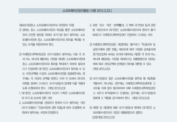 2013년 국내 IT 논점 중 가장 큰 논란거리는 ‘소프트웨어산업진흥법’이다. 개정된 ‘SW산업진흥법’제24조 2항 ‘중소 소프트웨어사업자의 사업참여 지원’규정을 통해 자산총액 5조 원 이상의 상호출자제한(상출제)기업집단 중 총 62개(민간 51개, 공기업집단 11개) 기업집단 소속 IT서비스 기업들은 공공정보화시장에 원칙적으로 참여할 수 없게 됐다.